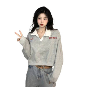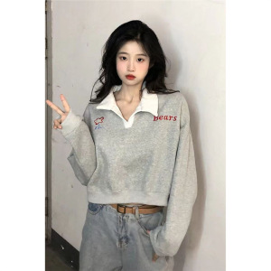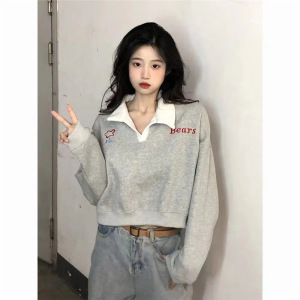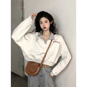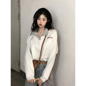 美式复古撞色polo领字母绣花网红卫衣女春秋款小个子短款上衣外穿