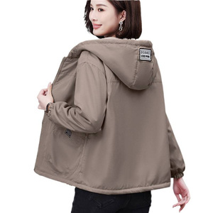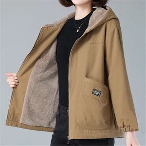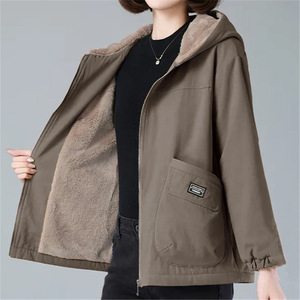 加绒大码宽松连帽短外套女新款秋冬中老年妈妈装大口袋保暖风衣女