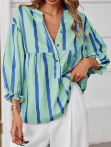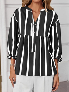 亚马逊跨境欧美2025夏秋新款女装条纹衬衫泡泡袖宽松上衣爆款女