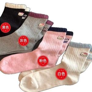 可爱卡通初秋袜子女后跟刺绣小猫咪AB不对称学生外穿堆堆中筒长袜