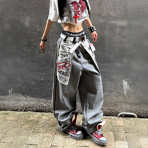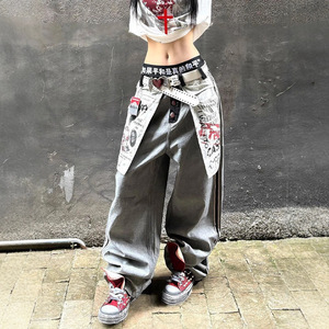 美式复古辣妹设计感街头风牛仔裤子女夏反穿大口袋主题印花拖地裤