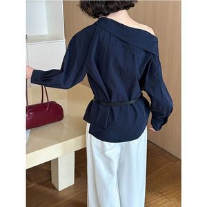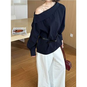 藏青色一字肩露肩爆款2025欧货衬衫女法式掐腰衬衣解构老钱风上衣