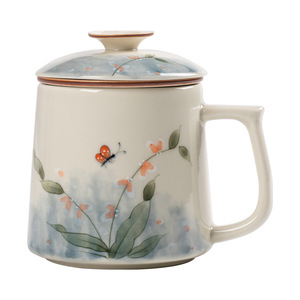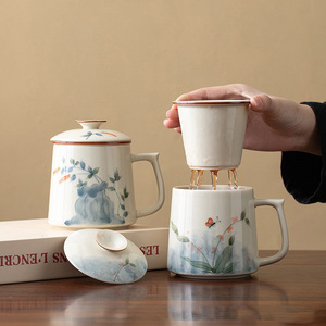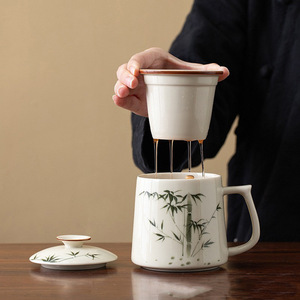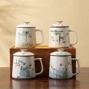 草木灰手绘青花陶瓷办公泡茶个人专用茶水分离过滤办公杯带盖茶杯