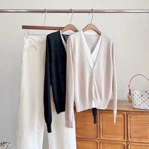 082407 秋季新款女假两件针织V领开衫女宽松短款长袖撞色拼接毛衣
