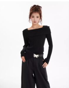 灰色一字肩长袖针织衫女秋冬季不规则内搭打底衫短款毛衣修身上衣