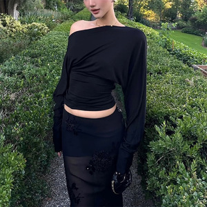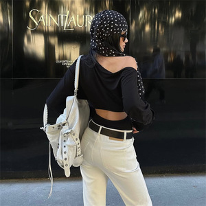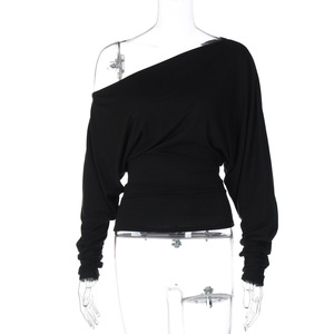 欧美ins风女装2025秋季新款时尚街拍斜领露肩长袖收腰显瘦T恤上衣
