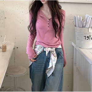 法式韩女亨利领chao舒服!撞色扣长袖打底tee上衣 女2025夏季新款