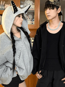 美式复古铆钉拼接杜宾犬卫衣男秋季潮牌设计感重磅连帽衫短款外套