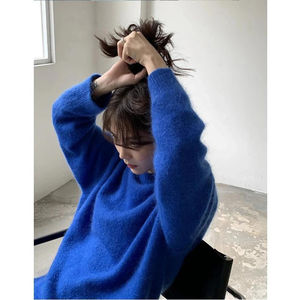 韩系宽松圆领克莱因蓝色套头毛衣女外穿2025秋冬新款高级感针织衫