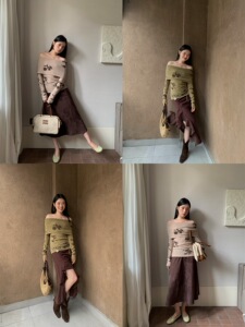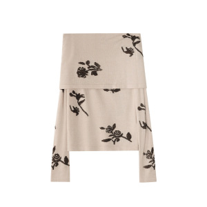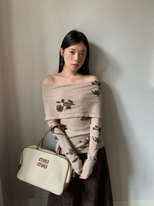 诠释美 NEWOPEN 25秋法式复古软糯绣花一字肩卷边针织毛衣女F6586