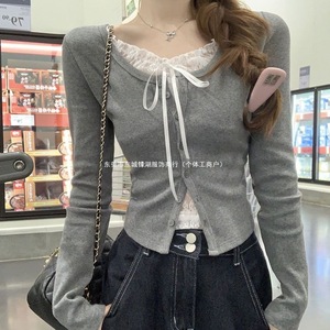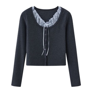 假两件撞色蕾丝拼接甜美长袖开衫女秋季新款单排扣修身短款上衣