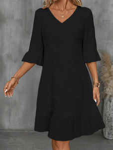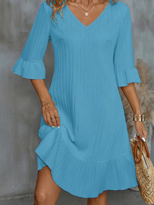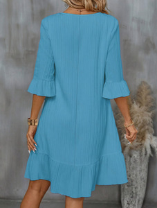 2025夏季新款亚马逊跨境欧美纯色V领喇叭袖中长裙连衣裙女装