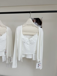 2025秋季新款 白色无扣开衫蕾丝花边吊带上衣针织套装两件套