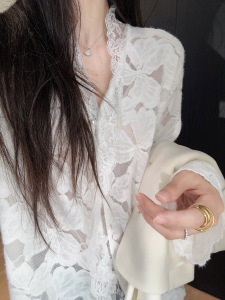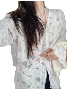 早秋浪漫邂逅 法式立体绒感蕾丝衬衫V领珍珠扣花瓣长袖女G081901