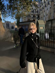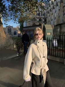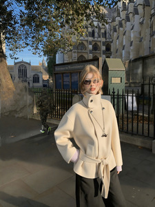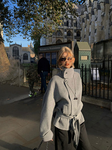 亚马逊独立站2025秋冬跨境外贸女装休闲优雅两侧荷包腰带毛呢外套