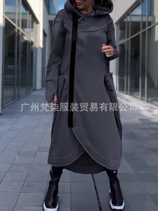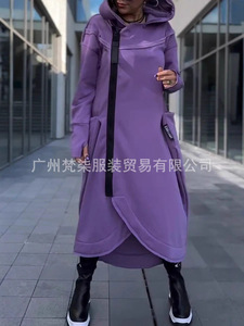 2025秋冬欧美跨境亚马逊百搭纯色长袖卫衣连帽拉链休闲长款连衣裙