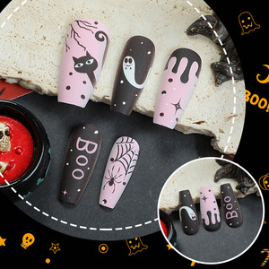 30片万圣节爆款跨境中梯穿戴甲精品彩绘黑粉色小鬼小猫血滴美甲片