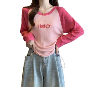 抽绳坑条拼接撞色长袖t恤女春秋冬2025新款女装宽松显瘦大码上衣