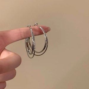 银色双层圈圈耳环女轻奢高级感气质大耳圈圆圈耳钉素圈耳夹耳饰