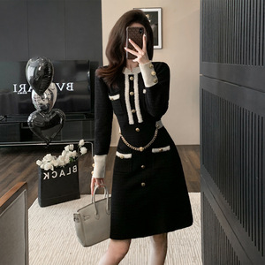 7501名媛小香风轻奢高级感链条拼接针织裙秋季新款炸街拼色连衣裙