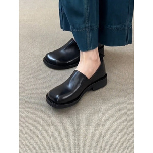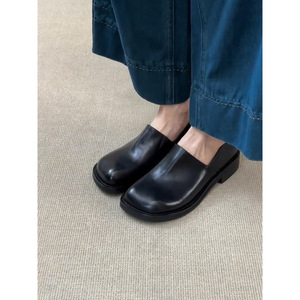 牛皮版~复古一脚蹬乐福鞋女简约英伦粗跟黑色小皮鞋方头深口单鞋