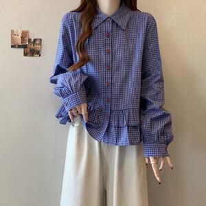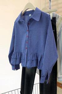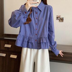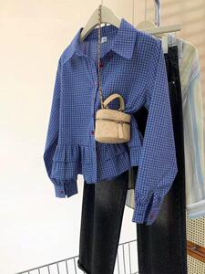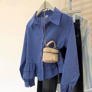 蓝色格子荷叶边长袖衬衫女秋季2025新款设计感小个子衬衣短款上衣