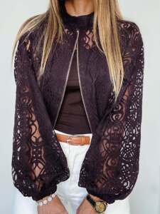 欧美女士蕾丝拉链夹克时尚外套跨境亚马逊爆款开衫镂空长袖夹克