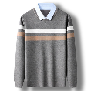 直播同款假两件男士针织衫棉质衬衫领高级感条纹商务加绒保暖毛衣