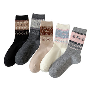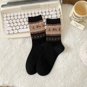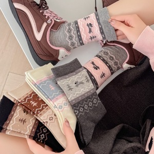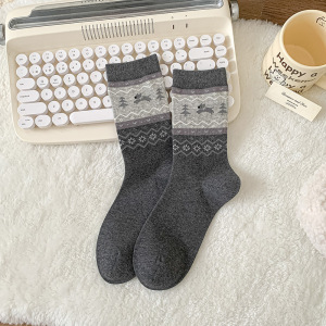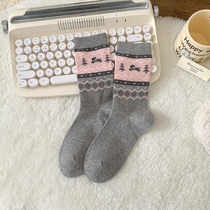费尔岛袜子女精梳棉2025秋季新款无骨中筒袜日系卡通小狗袜子灰色