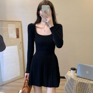 方领长袖针织连衣裙女秋冬季新款法式修身显瘦A字百褶打底中长裙