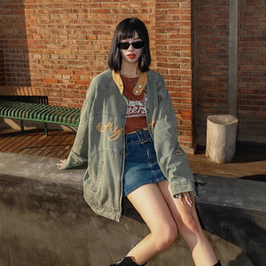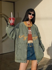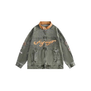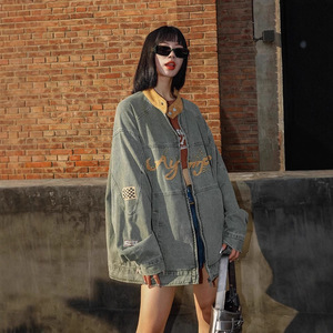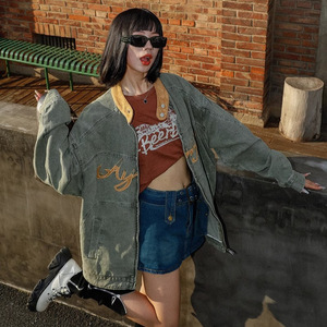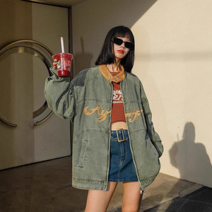 复古水洗刺绣贴布牛仔外套女高级感做旧嘻哈麂皮绒领拼接拉链夹克
