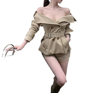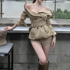 一字领韩式双排扣翻领短款风衣女2025新款欧尼感气质百搭休闲短裤