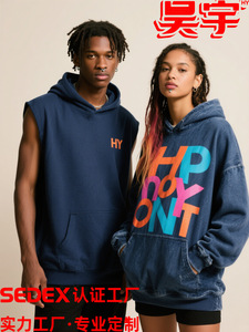 HY男装定制潮牌无袖套头卫衣石磨洗水做旧连帽卫衣多彩印花上衣