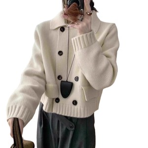 2025新款跨境秋冬新款双排扣假口袋翻领针织开衫毛衣外套女士外套