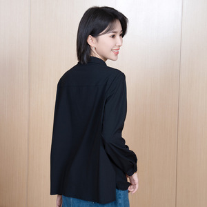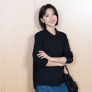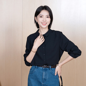 YUN韫春秋新款纯色翻领衬衫女宽松大码开衫时尚洋气显瘦黑色衬衫