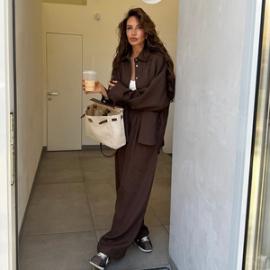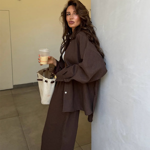 欧美跨境女装2025秋季新款时尚棕色翻领长袖衬衫阔腿长裤休闲套装