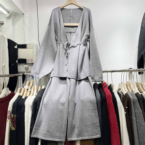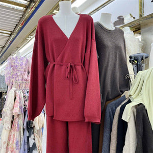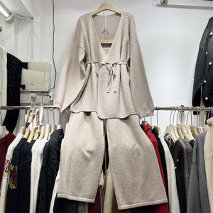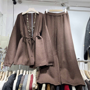 欧美2025新款秋冬休闲针织套装减龄附腰带阔腿裤针织毛衣宽松套装