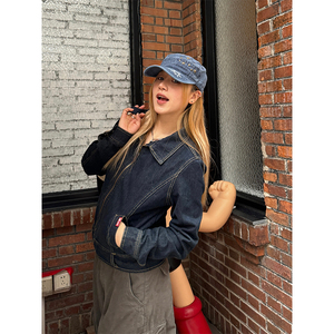 跨境川川也美式做旧修身牛仔夹克外套女复古短春秋新衣cleanfit深