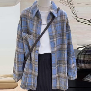 韩式休闲松弛感磨毛呢面衬衣女春秋新款宽松显瘦潮流百搭格子衬衫
