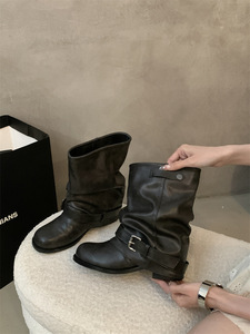 UNIDSN复古时髦裤管靴圆头皮带扣粗跟堆堆短靴炸街百搭马丁靴