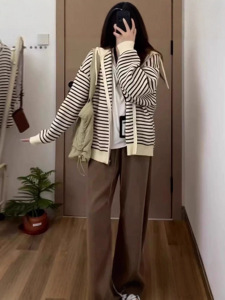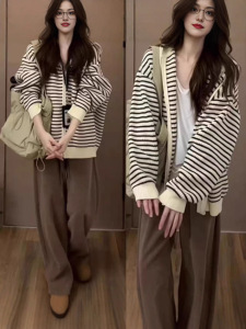 抽绳连帽条纹针织开衫秋冬韩版宽松慵懒风外穿学院风毛衣外套女装