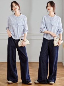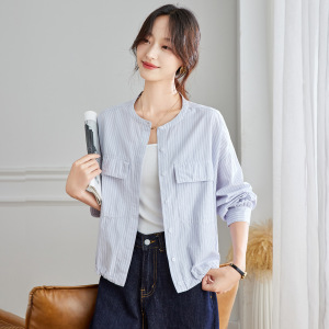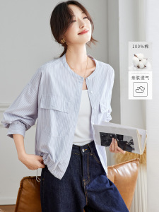 棉茧 松弛老钱风复古条纹衬衣女装秋季新款立领宽松下摆抽绳上衣