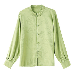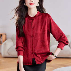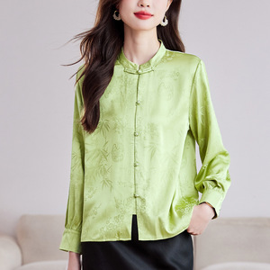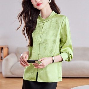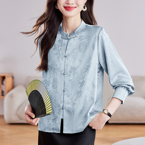 新中式缎面提花衬衫女2025秋季新款国风盘扣衬衫女立领上衣批发