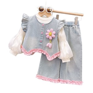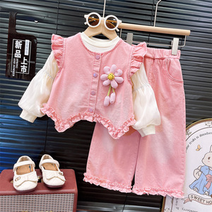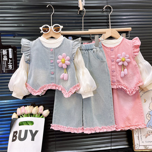 中大童套装2025秋季新款甜美花朵牛仔马甲打底衫牛仔裤三件套