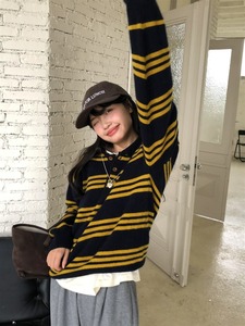 韩国复古POLO领条纹针织衫女秋冬新款宽松显瘦学院风毛衣外搭上衣