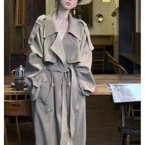 从一时刻老派审美韩系翻领风衣外套秋亚麻肌理感双排扣中长款