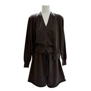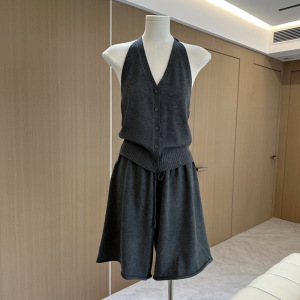 塞纳秋季新款韩版百搭显瘦V领针织开衫+挂脖背心+抽绳短裤套装