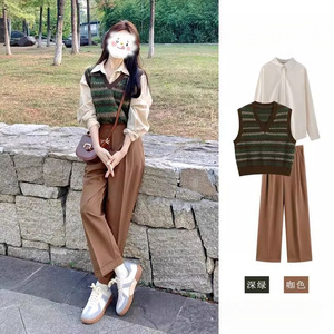 早秋美拉德穿搭盐系温柔炸街奶乖衬衫马甲叠穿搭配休闲裤三件套女