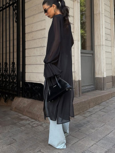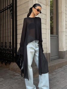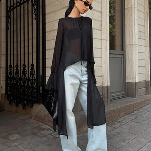 欧美风通勤女装黑色网纱不规则小众设计感圆领飘带荷叶袖长袖上衣