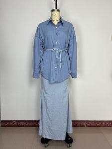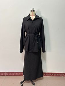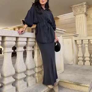 跨境外贸欧美女装2025年秋季新款纯色腰带开衫柔美气质长裙套装